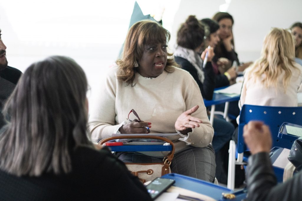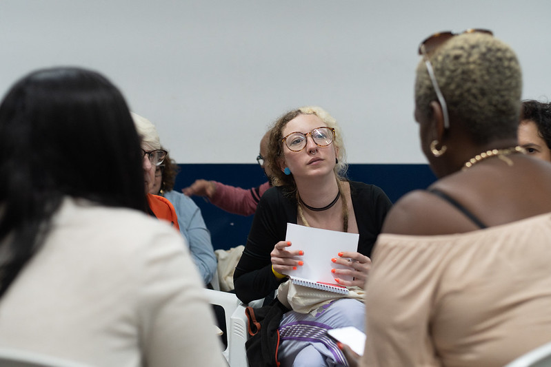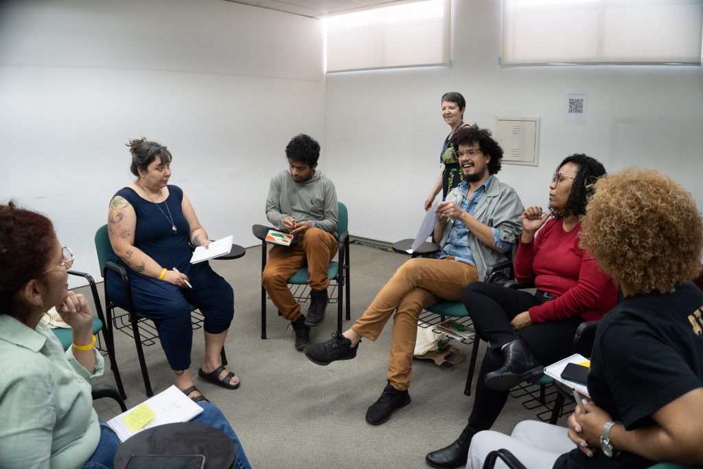 Formadoras do Instituto Vladimir Herzog conduziram um trabalho de reflexão em grupos a partir de questões norteadoras. Ao final, em plenária, as análises eram socializadas e debatidas coletivamente.