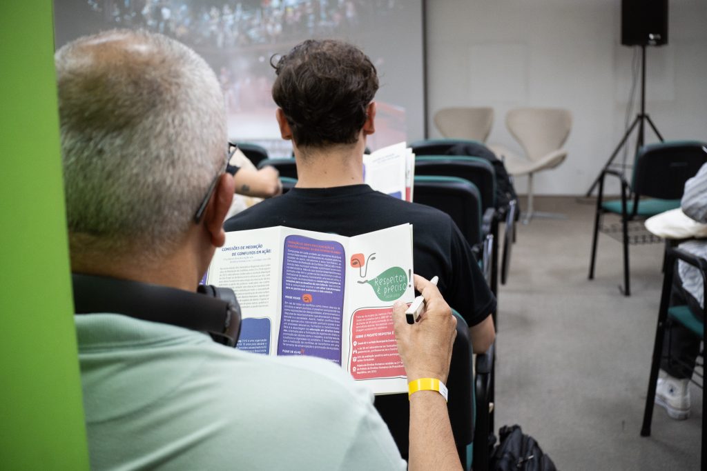 A cada dia de Seminário, entre 25 e 29 de agosto, ocorreram três oficinas simultâneas, focadas em experiências concretas vivenciadas por Comissões de Mediação de Conflitos em diferentes etapas de ensino — da educação infantil ao ensino fundamental —, apresentadas pelos/as próprios/as educadores/as que as realizaram.
